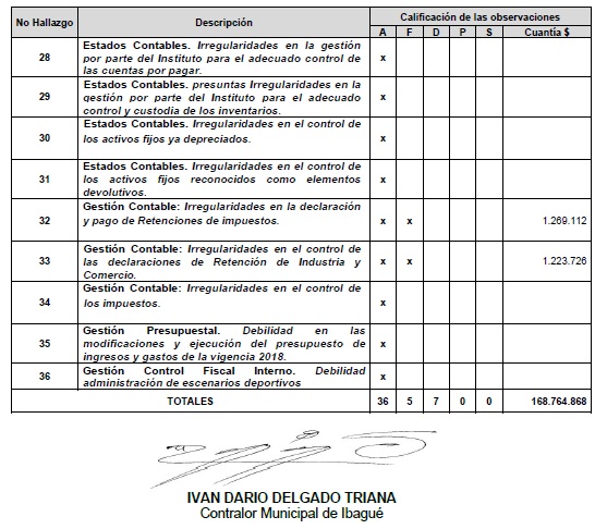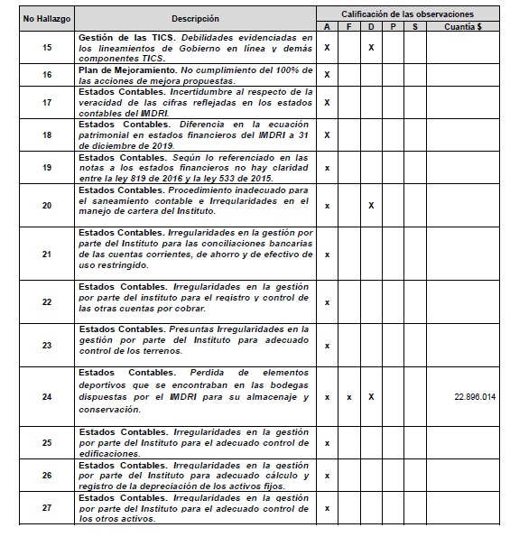 Para la Contraloría, el instituto en desarrollo de los objetivos plasmados en el Memorando de Asignación No. 004 del 17 de febrero de 2020, presentó una gestión fiscal calificada como desfavorable con una calificación de 70.0 y un no fenecimiento de la cuenta. Como resultado, dejó 36 hallazgos, de los cuales 5 de esos son fiscales por un valor de $168 millones.